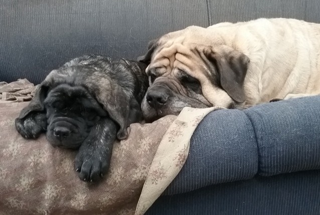 They thrive in a family home or if someone works from home, they love to be with you as much as possible and will follow you where ever you go. Even known to wait beside the shower or outside the toilet door. They don’t need a huge amount of exercise, they are happy to do as much as you want to... A mastiff will be as content snuggled up on the couch with you, as it would be walking miles on a rainy weekend afternoon. Health of the Mastiff compares favourably with other giant breeds. Four conditions known to appear are : hip & elbow dysplasia, osteochondrosis, bloat and cruciate ligament rupture. Bloat is a problem that every giant breed owner should be familiar with. Research is still being carried out to determine the cause of this life threatening condition. Cruciate ligament rupture speaks for itself. It is the ligament that crosses the knee. Once again any breeder will discuss these matters with you. Pet insurance is recommended, vets bills like mastiffs can be large!